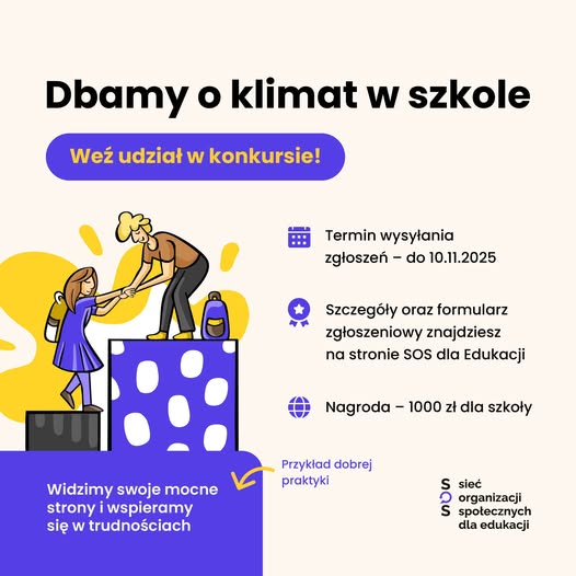 Zachęcamy do udziału w konkursie SOS dla Edukacji „Dbamy o klimat w szkole”, którego celem jest wyróżnienie i upowszechnienie najlepszych przykładów działań nauczycielskich wspierających uczniów i uczennice, budujących zdrowe relacje oraz tworzących pozytywną atmosferę w szkole – miejscu, w którym wszyscy chcą przebywać i uczyć się.