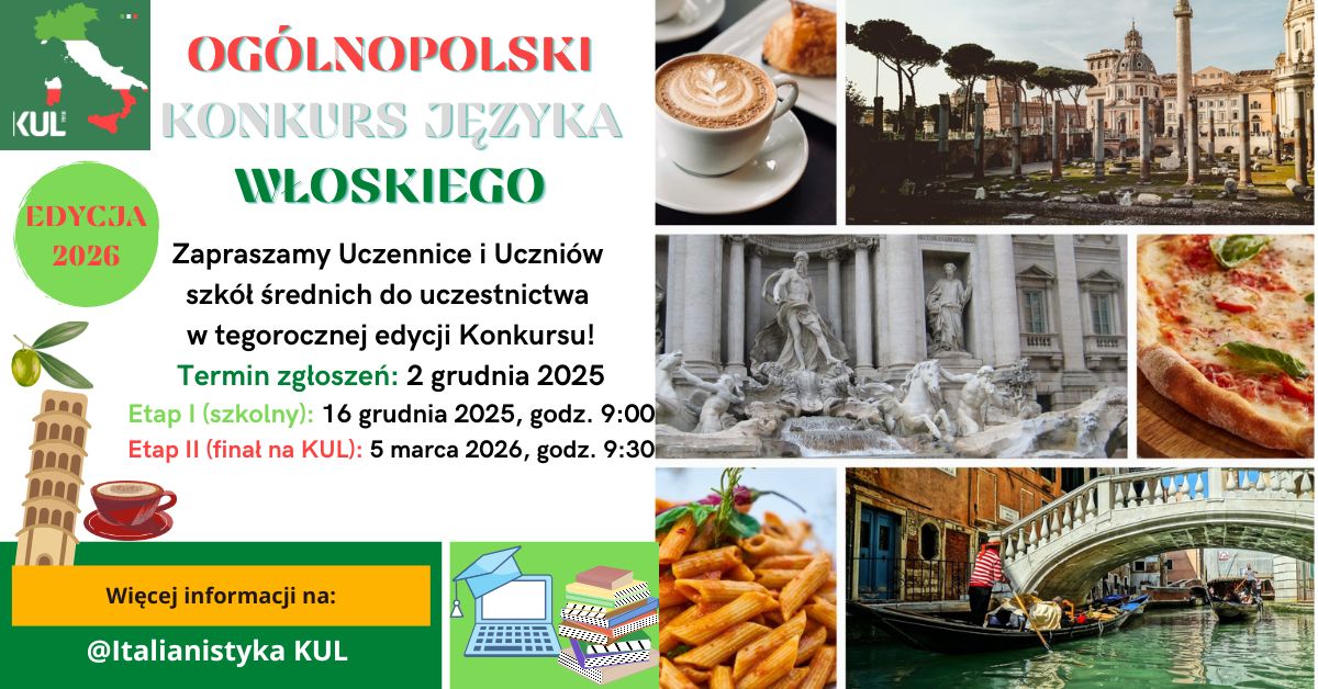 Kolegium Romanistyki, Hispanistyki i Italianistyki Katolickiego Uniwersytetu Lubelskiego organizuje Ogólnopolski Konkurs Języka Włoskiego – edycja 2026 dla uczennic i uczniów szkół średnich.