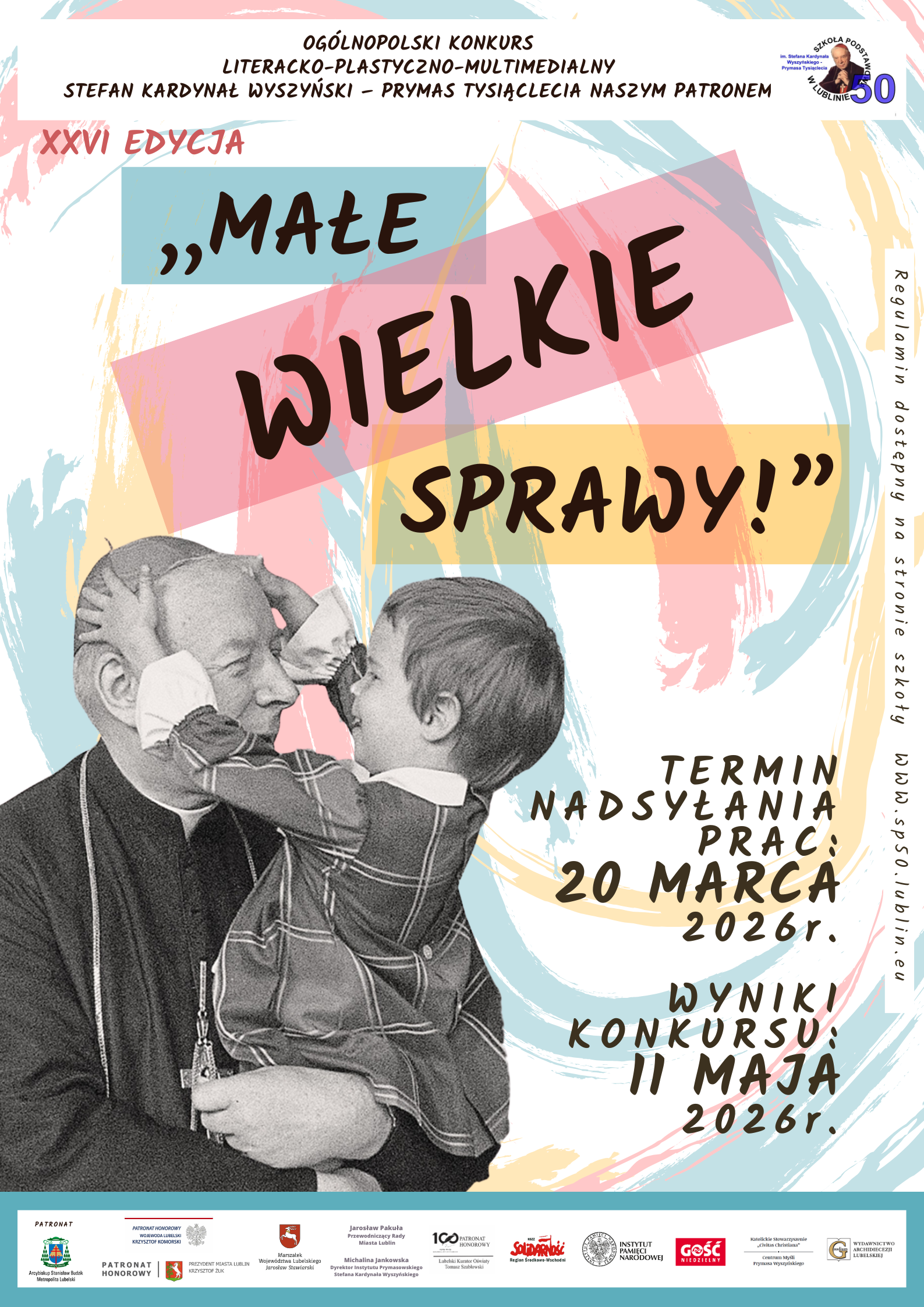 Zapraszamy uczniów szkół podstawowych i ponadpodstawowych do udziału w Ogólnopolskim Konkursie Literacko-Plastyczno-Multimedialnym „Stefan Kardynał Wyszyński – naszym Patronem”, który organizuje Szkoła Podstawowa nr 50 im. Stefana Kardynała Wyszyńskiego – Prymasa Tysiąclecia w Lublinie. Tegoroczna edycja konkursu odbywa się pod hasłem „MAŁE WIELKIE SPRAWY!”, a jej inspiracją są słowa bł. Prymasa Tysiąclecia: „Wiadomo, że nie powstało wiele dobrych rzeczy, dlatego że czekało się na lepsze”.