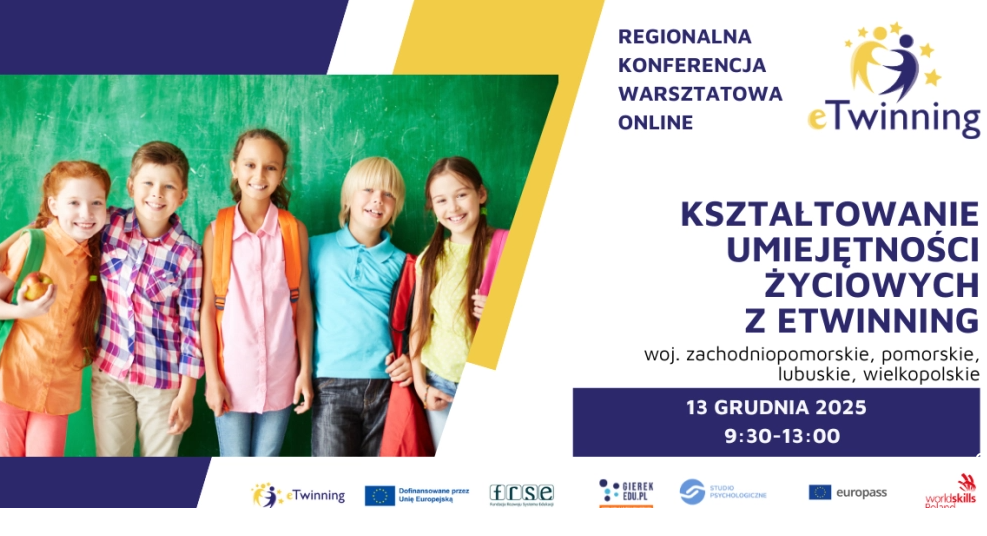 Fundacja Rozwoju Systemu Edukacji oraz Krajowe Biuro eTwinning serdecznie zapraszają nauczycieli przedszkoli, szkół podstawowych i ponadpodstawowych z województw: zachodniopomorskiego, pomorskiego, lubuskiego, wielkopolskiego na regionalną konferencję online pt. „Kształtowanie umiejętności życiowych z eTwinning”.