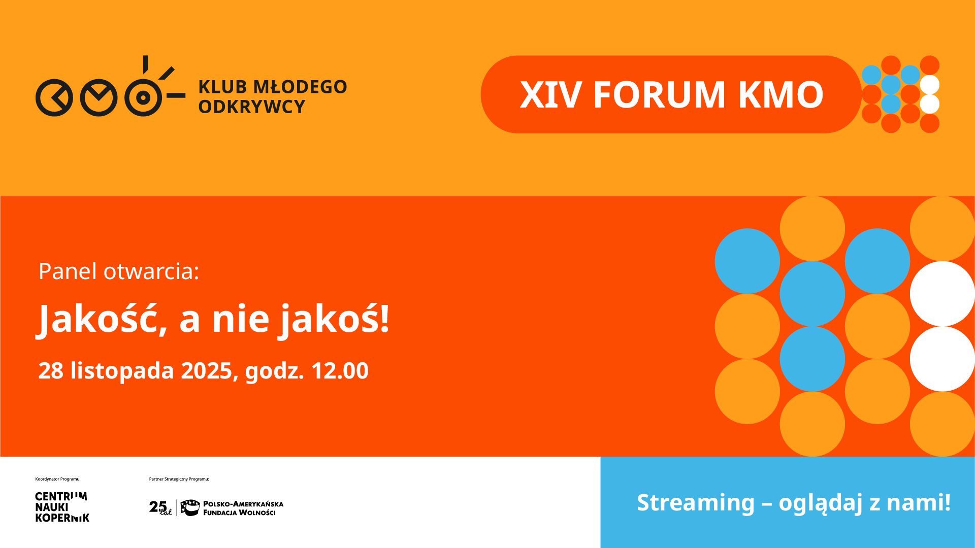 Centrum Nauki Kopernik i program Klub Młodego Odkrywcy zapraszają nauczycieli, edukatorów i wszystkich pracujących z młodymi ludźmi do udziału online w panelu otwierającym XIV Forum Klubu Młodego Odkrywcy (KMO) pod hasłem „Jakość, a nie jakoś!”. Wydarzenie odbędzie się 28 listopada 2025 r. o godz. 12.00 i będzie ważnym głosem w dyskusji o tym, czym jest jakość w procesie uczenia się oraz jak – z perspektywy edukatora – można o nią dbać i ją kształtować.