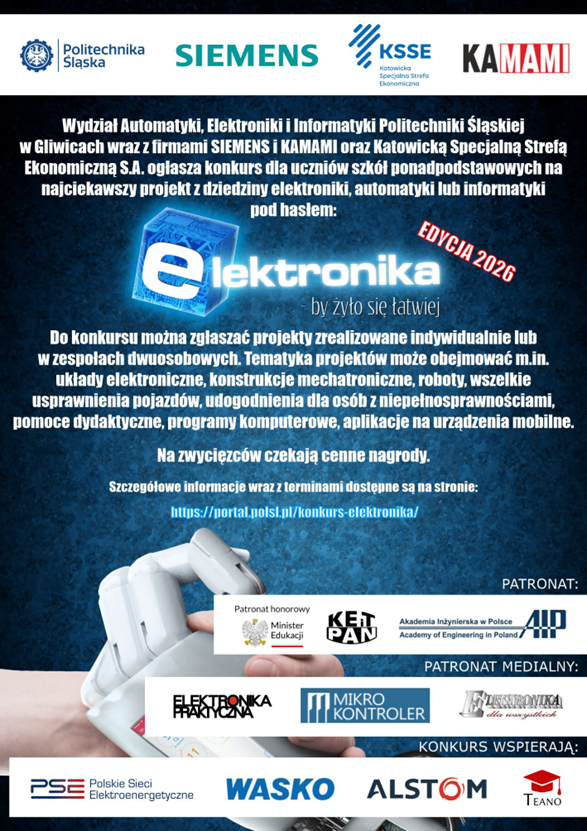 Wydział Automatyki, Elektroniki i Informatyki Politechniki Śląskiej wraz z partnerami już po raz dziewiąty organizuje konkurs dla uczniów szkół ponadpodstawowych „Elektronika – by żyło się łatwiej” im. dr. inż. Andrzeja Malchera. Konkurs obejmuje swoim zasięgiem obszar całej Polski.