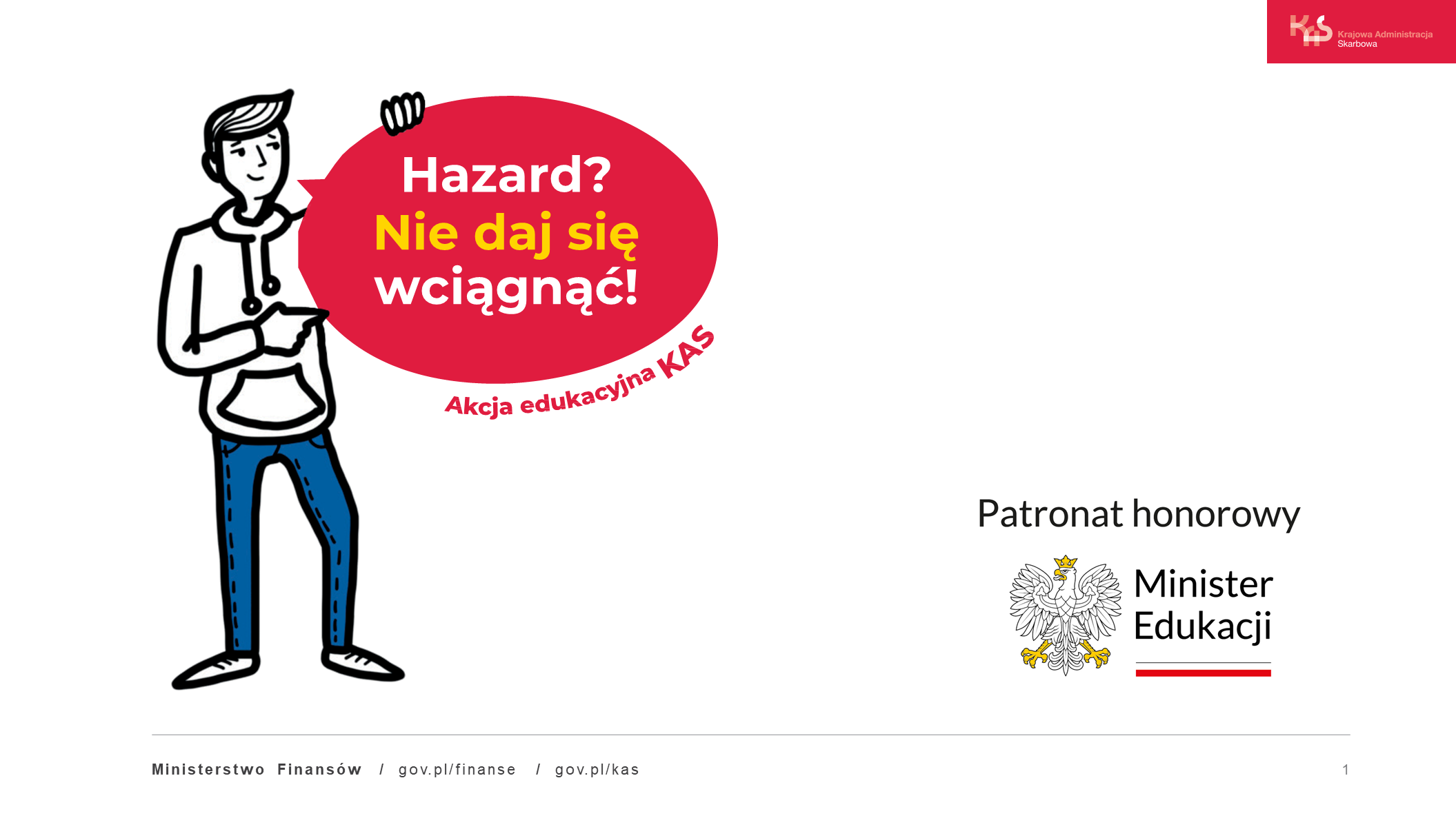Szanowni Państwo, Izba Administracji Skarbowej w Zielonej Górze wznawia wraz z całą Krajową Administracją Skarbową (KAS) akcję edukacyjną „Hazard? Nie daj się wciągnąć!” 2025/2026. Akcja prowadzona jest cyklicznie od 2018 roku, a jej adresatami są przede wszystkim uczniowie klas 7 i 8 szkoły podstawowej oraz młodzież ze szkół średnich.