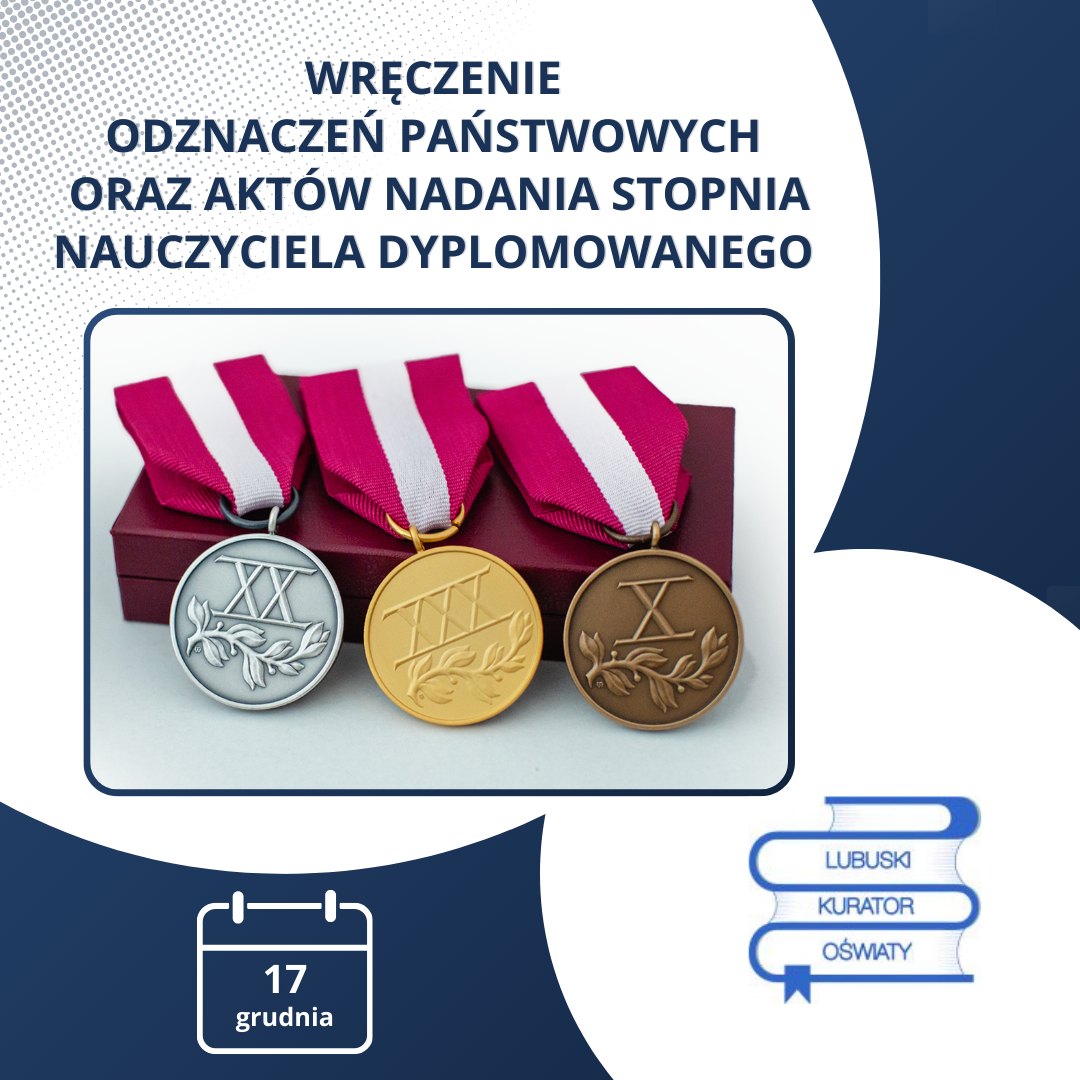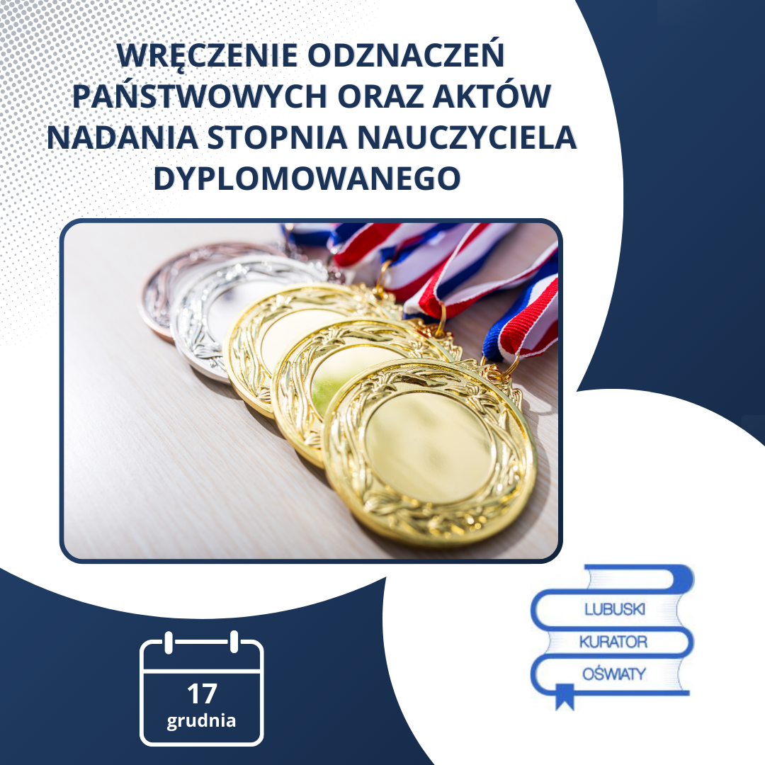 Dnia 17 grudnia 2025 r. o godzinie 10:00 w auli Akademii im. Jakuba z Paradyża w Gorzowie Wielkopolskim, przy ulicy Chopina 52, budynek 5 odbędzie się wojewódzka uroczystość wręczenia odznaczeń państwowych oraz aktów nadania stopnia nauczyciela dyplomowanego. Zapraszamy wszystkich odznaczonych i wyróżnionych nauczycieli, dyrektorów oraz pracowników administracyjnych szkół i placówek oświatowych województwa lubuskiego. Poniżej publikujemy link do listy wyróżnionych osób.