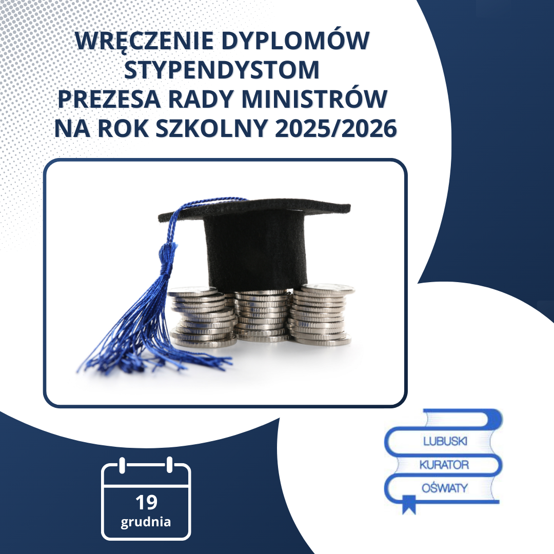 Lubuski Kurator Oświaty serdecznie zaprasza Stypendystów Prezesa Rady Ministrów wraz z opiekunami na uroczyste wręczenie dyplomów, które odbędzie się 19 grudnia 2025 r. o godz. 10.00 w Centrum Kształcenia Zawodowego i Ustawicznego w Sulechowie, przy ul. Piaskowej 53.
